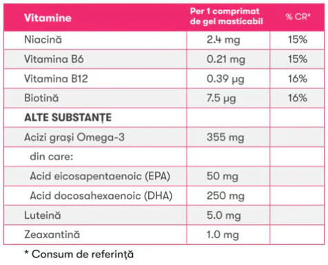 INGREDIENTE: concentrat de ulei de pește, îndulcitor (xilitol), apă, îndulcitor (sorbitol), gelatină, arome naturale, corector de aciditate (citrat trisodic), mixtură de luteină și zeaxantină, corector de aciditate (acid citric), antioxidant (acid ascorbic), niacină (nicotinamidă), îndulcitor (glicozide steviolice din stevia), vitamina B6 (clorhidrat de piridoxină), vitamina B12 (ciancobalamină), biotină (D-biotină). Indicații alergologice: pentru alergeni, verificați ingredientele scrise îngroșat.