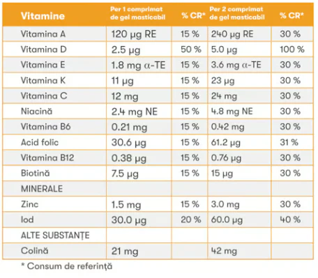 INGREDIENTE: ulei de floarea-soarelui, îndulcitor (xilitol), apă, îndulcitor (sorbitol), gelatină, bitartrat de colină, corector de aciditate (citrat trisodic), vitamina C (acid L-ascorbic), bisglicinat de zinc, vitamina E (D-alfa-tocoferol), aromă naturală, niacină (nicotinamidă), Vitamin K2 (menachinonă), emulsifiant (lecitină), colorant (extract de ardei roșu), îndulcitor (glicozide steviolice din stevia), vitamina B6 (clorhidrat de piridoxină), vitamina A (palmitat de retinil), acid folic (acid (6S)-5-metiltetrahidrofolic, sarea de glucozamină), vitamina B12 (ciancobalamină), iodură de potasiu, vitamina D (colecalciferol), biotină (D-biotină).