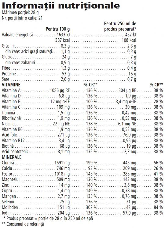 – un aport de 15 gr de proteine de inalta calitate / portie